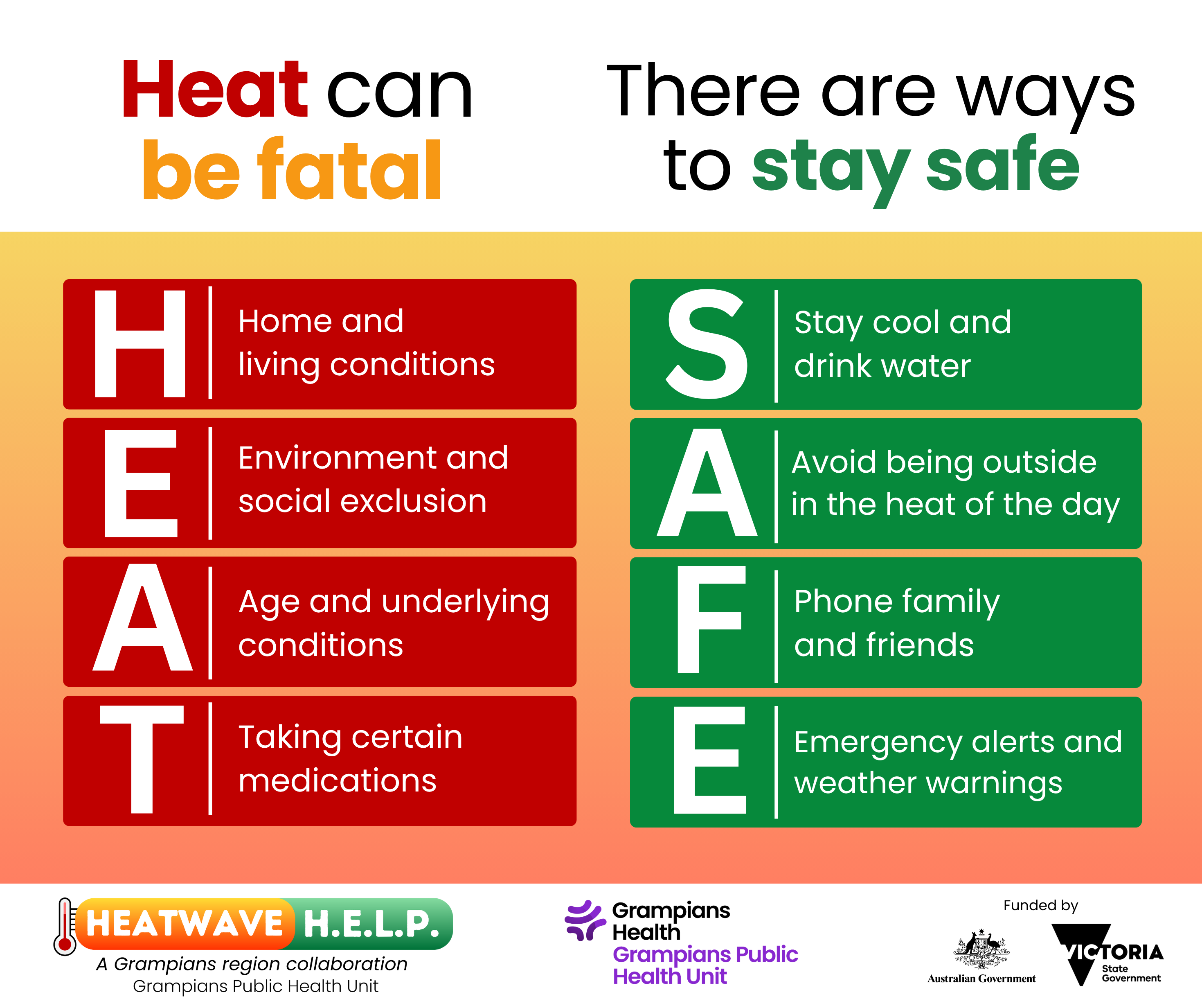 The Heatwave HELP project is funded 2024-2026 by the Australian Government and Victorian Government under the National Partnership Agreement on Disaster Risk Reduction. Our project seeks to find a reduction in adverse health impacts due to heat, using data collected via local emergency department visits, hospital admissions, Ambulance Victoria callout data, and from other sources.
